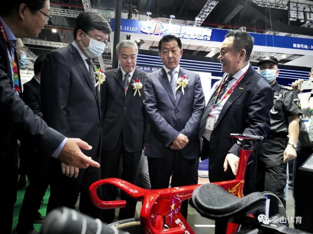 国家体育总局副局长李颖川、上海市副市长陈群、国家体育总局体育器材装备中心主任孙为民、上海市体育局局长徐彬在开云集团产业集团卞志良董事长陪同下参观开云集团展厅。