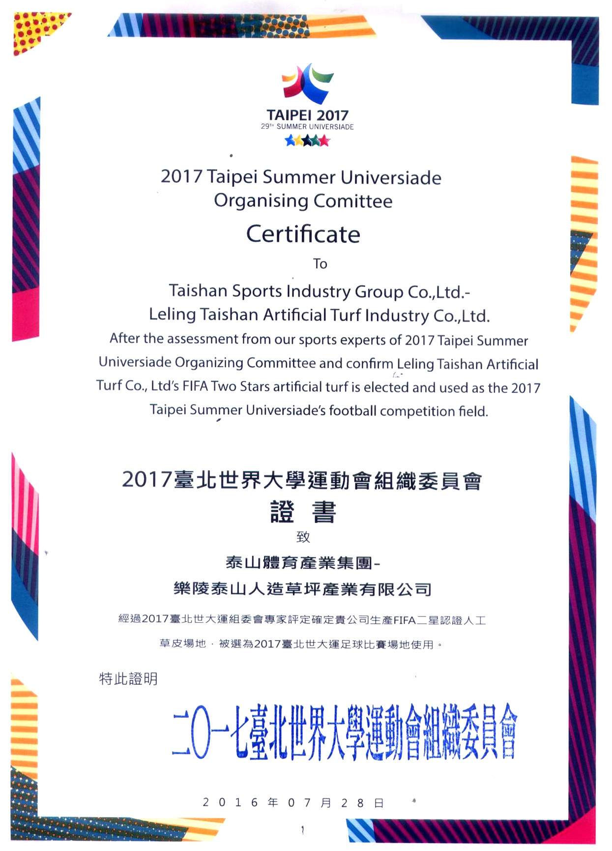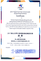 2017台北世界大学运动会组织委员会证书致乐陵开云集团人造草坪产业有限公司